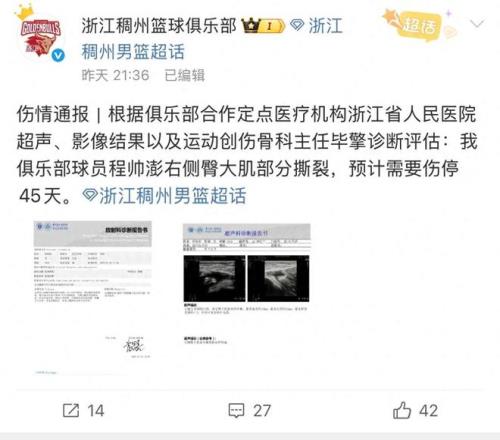 浙江男篮官方发文,程帅澎右侧臀大肌部分撕裂,预计需要伤停45天。