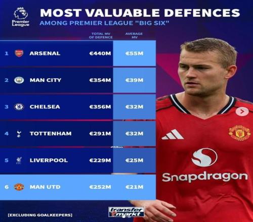 德转盘点了英超Big6球队在防御方面上主力替补们身价(不包括门将),其中阿森纳高居榜首,具体如下(防守人身价+平均身价),对比来看阿森纳出色可靠有数字支撑: