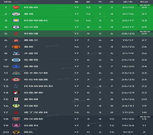 北京时间12月21日,英超第17轮结束了8场比赛,最新积分榜如下!